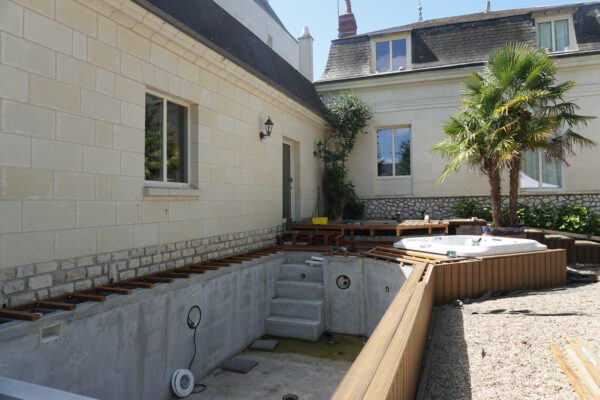 Piscine à débordement avec margelles en pierre et bâtiment rénové - Construction pisciniste Angers